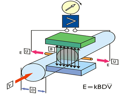據(jù)法拉*電磁感應(yīng)定律,測(cè)量管道內(nèi)的流動(dòng)的導(dǎo)電液體(等效于許多連續(xù)的導(dǎo)電薄圓盤(pán))做垂直于磁場(chǎng)的運(yùn)動(dòng),產(chǎn)生感應(yīng)電動(dòng)勢(shì),電勢(shì)大小與流量相關(guān)。