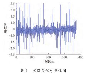 針對城市生活污水流量計測量水煤漿時出現(xiàn)較大波動,甚至回零這一問題,特去某煤化工企業(yè)甲醇分公司進行現(xiàn)場數(shù)據采集。該公司所使用的對置式四噴嘴氣化有4個噴嘴,噴嘴管道口徑為125mm,管中水煤漿流量基本穩(wěn)定在19m³/h(流速約為0.48m/s)。每條噴嘴煤漿線上安裝了3臺城市生活污水流量計,每臺城市生活污水流量計由傳感器和變送器兩部分組成。選擇其中1條水煤漿管線上的1臺城市生活污水流量計進行數(shù)據采集,因為該臺城市生活污水流量計測量結果波動大,甚至出現(xiàn)回零的現(xiàn)象。將課題組研制的基于DSP的電磁流量變送器的信號線和勵磁線接到該電磁流量傳感器的電極和勵磁線圈上,組合成完整的城市生活污水流量計,進行水煤漿數(shù)據采集。使用的電磁流量變送器是以TI公司DSP芯片TMS320F28335為核心,采用高頻勵磁方案,其硬件主要包括勵磁控制系統(tǒng)和信號采集處理系統(tǒng),具體的模塊有勵磁驅動模塊、信號調理采集模塊、信號處理控制模塊、人機接口模塊、通信模塊及電源管理模塊。信號調理采集模塊中的調理電路對一次儀表輸出的信號進行放大和濾波,截止頻率是2kHz,放大倍數(shù)約為230倍。通過NI公司USB-6216型號的數(shù)據采集卡進行數(shù)據采集,把調理電路的輸出端連接到數(shù)據采集卡的一個差分輸入端,并設置數(shù)據采集卡工作在差分的測量模式,設置采集卡的采樣頻率為10kHz。采集多組水煤漿信號數(shù)據,每組數(shù)據的時間長度為5min。