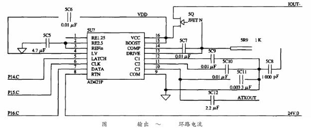 HT2012需要外部提供460.8kHz的時(shí)鐘信號(hào),且要求時(shí)鐘頻率的誤差是0.1%,若直接入一個(gè)460.8kHz的晶振不僅會(huì)引起系統(tǒng)功耗的增加,而且該晶振屬于非標(biāo)準(zhǔn)晶振,需專門定制。為了解決這一問題,在系統(tǒng)中采用一片1.8432MHz的晶振以產(chǎn)生時(shí)鐘信號(hào),再經(jīng)分頻器CD4013進(jìn)行4分頗,可輸出1.8432MHz/4=460.8kHz的分頻信號(hào)供HT2012使用。AD421其內(nèi)部的電壓調(diào)節(jié)器與外部的場效應(yīng)管DN25D對輸入到AD421的電壓進(jìn)行調(diào)整,可提供+3.3V電壓作為其他設(shè)備的電源。HART發(fā)出的FSK信號(hào),經(jīng)過一個(gè)電容耦合送到AD421中,轉(zhuǎn)換成相應(yīng)的0.5mA正弦電流信號(hào),實(shí)現(xiàn)電壓信號(hào)到電流信號(hào)的轉(zhuǎn)換,同時(shí),疊加在4~20mA的電流上送給接收設(shè)備,實(shí)現(xiàn)了HART協(xié)議的信息的交換。本電路耦合電容取為0.0033μF,如圖5所示。