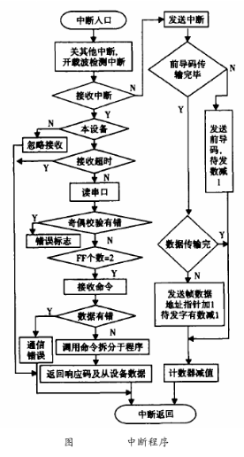 在HART通信中,雨水流量計(jì)作為從設(shè)備進(jìn)行通訊,所以這里的軟件設(shè)計(jì)只是針對于從設(shè)備。HART通信采用水平和垂直校驗(yàn)的方法。當(dāng)檢測到接收數(shù)據(jù)有差錯(cuò)時(shí),則等到主設(shè)備命令幀發(fā)完后,通知主設(shè)備數(shù)據(jù)接收有誤。主設(shè)備則重新發(fā)命令幀,從而保證通信的準(zhǔn)確可靠。HART中斷子程序流程圖如圖6所示。由于HART通信為主從方式,HART幀中每個(gè)字節(jié)在物理層傳輸需要9ms左右,為了保證通訊的實(shí)時(shí)性,通訊程序采用串行口終端接收/發(fā)送。該中斷所要完成通信中的主要任務(wù),即接收和發(fā)送幀,幀的拆分和打包。