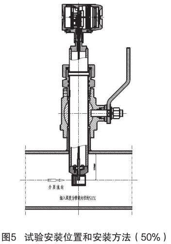 對(duì)插入式煙氣流量計(jì)和插入式電磁流量計(jì)的結(jié)構(gòu)原理進(jìn)行分析,插入式電磁流量計(jì)的信號(hào)采集點(diǎn)在標(biāo)校管道內(nèi)12.5% 為宜,因它屬電磁類流量計(jì),而煙氣流量計(jì)是根據(jù)“卡門渦街”原理進(jìn)行測(cè)量管道內(nèi)流量,根據(jù)標(biāo)校管道內(nèi)層流和湍流的分析,以及插入式煙氣流量計(jì)獨(dú)特的探頭結(jié)構(gòu)形式,確定插入式煙氣流量計(jì)的插入深度為標(biāo)校管道內(nèi) 50%,試驗(yàn)安裝位置和安裝方法如圖 5 所示。