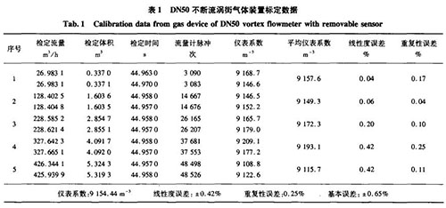 分別用精度0.5級音速噴嘴氣體標定裝置、精度0.2級稱重法水標定裝置對DN50口徑的不斷流渦街進行實際標定,其標定數(shù)據(jù)如表1、表2所示。