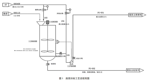 通過以上煤漿提濃通用方法優(yōu)缺點(diǎn)比較可以了解到,在現(xiàn)有設(shè)計(jì)條件基礎(chǔ)上,煤漿濃度提升會(huì)帶來一定設(shè)備損耗及能源損耗。針對(duì)這種情況,為了達(dá)到節(jié)能而保證蒸汽流量計(jì)不跑漿,對(duì)于磨機(jī)跑漿問題進(jìn)行改善,對(duì)跑漿進(jìn)行回收,重新送回磨煤機(jī)進(jìn)行二次研磨,降低了蒸汽流量計(jì)入口原料煤的粒度;同時(shí)降低了人員勞動(dòng)強(qiáng)度,改善了現(xiàn)場(chǎng)衛(wèi)生情況。具體跑漿回收裝置設(shè)計(jì)流程如圖 1 所示。