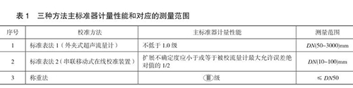 本規(guī)范包含三種校準方法,分別為標準表法 1(外夾式超聲流量計)、標準表法 2(串聯(lián)移動式在線校準裝置)和稱重法,編制組對每種方法進行了大量的實驗,并積極與管道式流量計生產(chǎn)廠家及用戶溝通探討,積累了豐富的經(jīng)驗,獲得了大量的實驗數(shù)據(jù),*終確定三種方法的主標準器計量性能和對應的測量范圍,如表 1 所示。