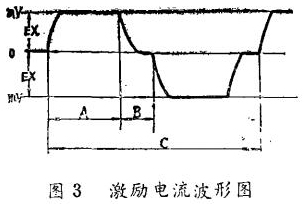 (1)激勵電流的波形檢查。在激勵電流檢查端EX+和EX一之間連接一個電阻(IΩ士0.1%),這個電阻與激勵線圈串聯(lián),示波器輸入端并聯(lián)在電阻上。若波形起伏很大時,則不正常。波形正,負方向?qū)ΨQ,A一C測量周期值在規(guī)定的范圍內(nèi)則為正常,其波形如圖3所示。