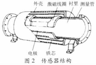 液體流量計(jì)由流量傳感器和轉(zhuǎn)換器兩部分組成。傳感器典型結(jié)構(gòu)示意如圖2,測(cè)量管上下裝有激磁線圈,通激磁電流后產(chǎn)生磁場(chǎng)穿過(guò)測(cè)量管,一對(duì)電極裝在測(cè)量管內(nèi)壁與液體相接觸,引出感應(yīng)電勢(shì),送到轉(zhuǎn)換器。激磁電流則由轉(zhuǎn)換器提供。
