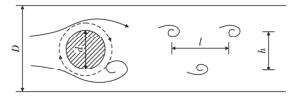 渦街氣體流量計(jì)是由漩渦發(fā)生體、頻率檢測(cè)器和信號(hào)轉(zhuǎn)換器等環(huán)節(jié)組成,輸出 4 ~ 20 mADC 信號(hào)或脈沖電壓信號(hào)。其測(cè)量原理是在流動(dòng)的流體中的垂直流動(dòng)方向安放 1 根或多根非流體型阻流體,在一定的流量范圍內(nèi),流體在阻流體兩側(cè)交替地分離、釋放出 2 串頻率正比于管道內(nèi)的平均流速、規(guī)則的、不對(duì)稱有規(guī)律的交替漩渦列,如圖 1 所示,且兩側(cè)漩渦旋轉(zhuǎn)方向相反 。采用檢測(cè)元件測(cè)出漩渦頻率就可以推算出流體的流量。