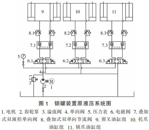 防爆型渦街流量計(jì)原液壓系統(tǒng)圖如圖 1 所示。 通過分析圖 1 發(fā)現(xiàn),原液壓系統(tǒng)中剪叉油缸組、托爪油缸組及鎖爪油缸組并聯(lián)安裝,并均由齒輪泵供油,該系統(tǒng)設(shè)計(jì)簡(jiǎn)單,液壓元件選擇不夠合理,工作效率低,電機(jī)發(fā)熱大,主要存在的問題: