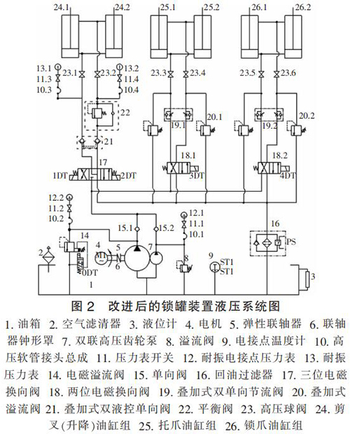 (2)由于升降油缸和托、鎖爪油缸的工況不同,所需油壓也不同,原液壓系統(tǒng)中齒輪泵統(tǒng)一供油,整個(gè)工作過程中系統(tǒng)功率消耗大,不夠節(jié)能,工作電機(jī)始終帶載運(yùn)行,不僅功率損耗大,而且易引起油溫急劇增加,對(duì)整個(gè)提升系統(tǒng)及液壓系統(tǒng)的性能和壽命造成惡劣影響;
