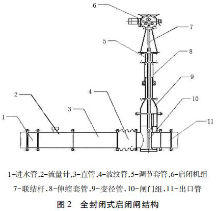 包括進水管、直管、出水管、夾持式渦街流量計組和啟閉機組,進水管、直管、出水管從左到右依次連接,夾持式渦街流量計組安裝在直管和出水管之間且位于出水管的入口處,夾持式渦街流量計組通過聯(lián)結(jié)桿與啟閉機組的輸出端連接。為防止泥沙淤積影響啟閉,夾持式渦街流量計采用閘板式啟閉結(jié)構(gòu)。密封式啟閉閘為整體封閉管道式,全部采用不銹鋼材料,水流通過管道流出讓整個閘井內(nèi)干燥無水。伸縮套管與波紋管的設(shè)計讓檢修與清理淤泥更加方便。夾持式渦街流量計裝有荷載限制器,其布置受力明確、結(jié)構(gòu)緊湊、動作可靠。當?shù)蹙呱系暮奢d達到額定值的 110%時,或電機電流超過額定電流 150%時,系統(tǒng)自動切斷操作電源以保護設(shè)備安全。
