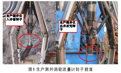測(cè)井儀底部氣體渦輪流量計(jì)在四上四下測(cè)井任務(wù)中轉(zhuǎn)速過快,地面直讀顯示該轉(zhuǎn)子的*高轉(zhuǎn)速達(dá)到260rps,超過了轉(zhuǎn)子的安全工作轉(zhuǎn)速.上限200rps,同時(shí)需長(zhǎng)時(shí)間滯留在產(chǎn)層位置進(jìn)行流壓測(cè)試操作,因此直接原因?yàn)檗D(zhuǎn)子在高溫高流速的極限工作環(huán)境下發(fā)生脫落,影響了測(cè)井?dāng)?shù)據(jù)的錄取,如圖1所示。