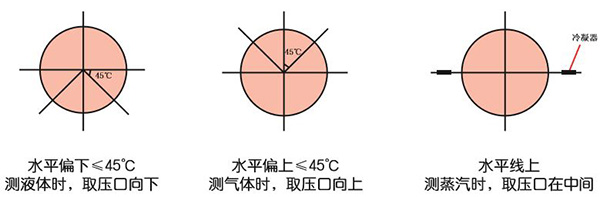 2、測氣體時,為防止液體進(jìn)入導(dǎo)壓管,取壓口方向應(yīng)處于水平線上偏45度的位置以內(nèi),正、負(fù)取壓口在同一水平面上。