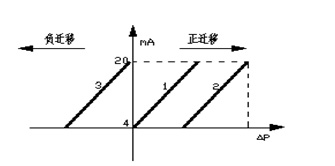 差壓變送器的零點(diǎn)遷移量分為正遷移與負(fù)遷移,在液位零點(diǎn)位置,當(dāng)正負(fù)壓室之間的壓差值P>0時(shí),為正遷移;P<0時(shí),為負(fù)遷移;P=0時(shí),無(wú)遷移。差壓變送器正負(fù)遷移特性曲線(xiàn)表示如下,見(jiàn)圖3: