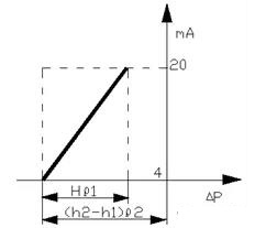以電動(dòng)差壓變送器為例,當(dāng)液位H為O時(shí),差壓變送器輸出的信號(hào)應(yīng)為4 mA,當(dāng)液位H為*高液位時(shí),差壓變送器輸出的信號(hào)應(yīng)為20 mA,這是一種比較理想狀態(tài)。從圖1可見(jiàn),當(dāng)被測(cè)介質(zhì)的密度為ρ,容器中液體以上部分的氣相并不會(huì)凝結(jié)成冷凝液,這時(shí)作用于變送器正負(fù)壓室的差壓應(yīng)為:△Р= Hρ。其曲線(xiàn)如圖2所示: