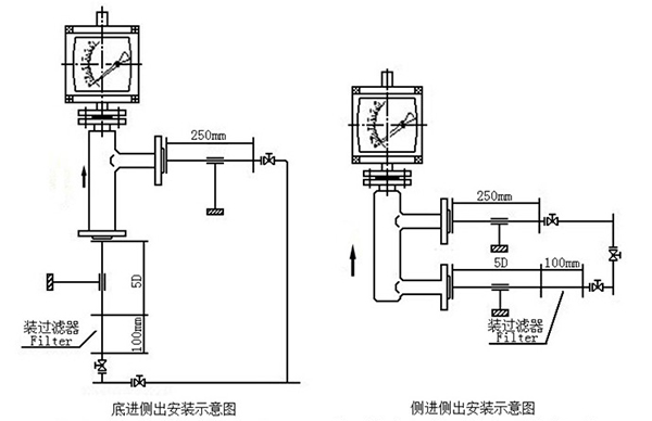 4.若介質(zhì)中含有固體雜質(zhì),應(yīng)在閥門和直管段間加裝過(guò)濾器;若介質(zhì)中含有鐵磁物質(zhì),應(yīng)在金屬浮子流量計(jì)的上游安裝磁過(guò)濾器。
