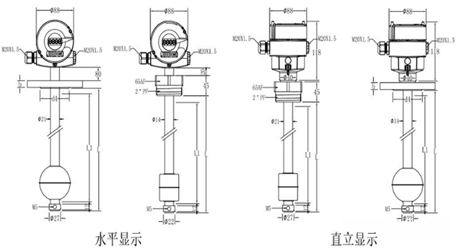 為更直觀地給用戶展現(xiàn)遠(yuǎn)傳浮球液位計(jì)的規(guī)格,請(qǐng)參考兩種遠(yuǎn)傳浮球液位計(jì)水平顯示以及直立顯示的不同規(guī)格尺寸,如下圖所示:
