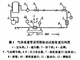 氣體流量管道周期振動試驗裝置結(jié)構(gòu)如圖1。為避免氣體壓力波動,圖中設備1先將空氣壓縮打人2中,經(jīng)3冷卻除濕后,得到的純凈氣體先后流經(jīng)4、5、7、10后,通向大氣。流量校準采用渦輪標準表法,渦輪流量計內(nèi)徑50mm,流量范圍5~100m3/h,精度為1%。兩臺壓力變送器的精度均為2‰。