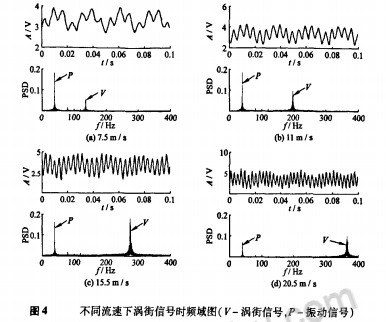 為了觀測管道周期振動下渦街流量信號的特征,利用NI USB-6009數(shù)據(jù)采集卡對渦街正弦信號進行采樣。以垂直方向管道振動加速度為0.1g為例,給出了不同流速下渦街信號的時頻域圖,如圖4所示。由時域部分可知,管道振動下渦街流量傳感器輸出的信號為真實旋渦脫落信號和管道振動信號的合成信號。低流速(≤1lm/s)時,管道振動信號強、占主要成分,渦街信號疊加在其上;隨著流速變大(11~20.5m/s),渦街信號逐漸顯露出來成為主要成分、淹沒振動信號。由頻域可知,振動信號成分較單一,呈尖峰狀,幅值為定值,不隨流速變化而變,除40Hz基頻外還有2、3倍頻出現(xiàn);而渦街信號成分稍復雜,呈塔峰狀,幅值隨流速變大而迅速增強,頻譜能量占總能量比重也隨流速增加而變大。