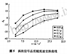 圖5給出了不同管道振動加速度下渦街信號品質(zhì)隨流速變化的情況。不論振動加速度如何變換,Sq的變化趨勢都是隨著流速的增加而變大,但Sq何時由負變正,則與振動加速度密切相關。相同流速下,管道振動加速度越大,Sq值越小,渦街信號品質(zhì)越差。Sq小于零時,表明由振動引起的其他頻帶能量大于渦街頻帶能量,且Sq絕對值越大,渦街信號品質(zhì)越差,渦街流量計的測量誤差越大;Sq大于零時,表明渦街頻率帶的能量大于其它頻帶的能量,管道振動對渦街信號影響較小,且Sq值越大,渦街信號品質(zhì)越好,渦街流量計的測量誤差越小。這也與圖3(a)得到的試驗結(jié)果完全吻合。