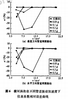 以應力式模擬渦街流量計為被測對象,在5m/s、7.5m/s、11m/s、15.5m/s、20.5m/s流速下,分別進行了無振動和施加管道周期振動的實流標定試驗。管道振動方向為垂直方向和水平方向,加速度為0.05-0.5g。根據(jù)試驗數(shù)據(jù),繪制出不同管道振動加速度下渦街儀表系數(shù)相對于無管道振動時平均儀表系數(shù)的相對誤差曲線,垂直方向結(jié)果如圖3(a)所示。