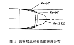 不同流動(dòng)狀態(tài)的水泥漿液流經(jīng)流量計(jì)測(cè)量管時(shí),管內(nèi)圓截面上會(huì)呈現(xiàn)不同的流速分布(見(jiàn)圖1),即: 層流的流速變化是拋物線(xiàn)分布,在管中心軸上流速*大,且雷諾數(shù)變化、流速分布形態(tài)不變;紊流時(shí),流速分布在測(cè)量管內(nèi)壁的近旁比層流流速大,在中心部比層流時(shí)流速小,且流速分布形態(tài)隨雷諾數(shù)的變化而變化。