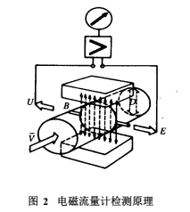 具有導(dǎo)電性的被測(cè)介質(zhì)液態(tài)以一定的速度流動(dòng)時(shí),則在與流動(dòng)方向垂直的方向上產(chǎn)生與流量成比例的感應(yīng)電勢(shì) E,其值為