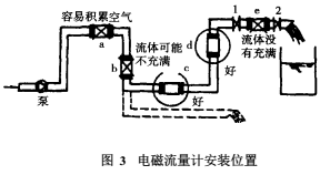 a,b,e為不宜位置(b處可能液體不充滿(mǎn),a和e處易積聚氣體,且 e處傳感器后管段短也有可能不充滿(mǎn));對(duì)于固液兩相流來(lái)說(shuō)c處亦是不宜位置。