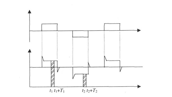 硫酸流量計(jì)一般都采用工頻交流電源供電, 其電源電壓的幅值和頻率的變化都會(huì)給硫酸流量計(jì)帶來(lái)電源性干擾噪聲。對(duì)電源電壓的幅值變化, 因采用多級(jí)集成穩(wěn)壓, 一般而言電源電壓的幅值變化對(duì)電磁流量的測(cè)量精度影響不大。當(dāng)電源電壓的頻率波動(dòng)時(shí), 雖然其波動(dòng)范圍有限, 但對(duì)硫酸流量計(jì)測(cè)量精度影響較大。為了解決工頻干擾問(wèn)題, 實(shí)現(xiàn)對(duì)流體流速感應(yīng)電勢(shì)eab信號(hào)的準(zhǔn)確測(cè)量, 需利用以下基本關(guān)系:①勵(lì)磁周期為工頻周期的整數(shù)倍, 即勵(lì)磁頻率為50/nHz(n為偶數(shù));②正負(fù)勵(lì)磁下的同相位采樣。圖2是對(duì)應(yīng)低頻矩形波勵(lì)磁形式下的典型電勢(shì)信號(hào)形式, 按上述關(guān)系在一個(gè)勵(lì)磁周期下, 若假設(shè)t1 和t2 點(diǎn)為工頻干擾的等效干擾點(diǎn), 且采樣寬度T=T1 =T2 , 則eab的基本算式為: