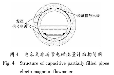 ②電容式非滿管軟化水流量計(jì)h。電容式非滿管軟化水流量計(jì)結(jié)構(gòu)簡(jiǎn)圖如圖4所示。、檢測(cè)信號(hào)電極 發(fā)送信號(hào)電