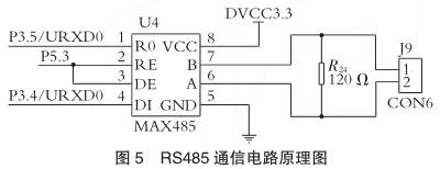RS485接口組成半雙工網(wǎng)絡,選擇兩線制與上位機電腦相連,采用屏蔽雙絞線傳輸。通信系統(tǒng)整體為總線式結(jié)構(gòu),這樣1臺上位機*多可以和現(xiàn)場32臺智能儀表相連。采用MAX485芯片完成電壓轉(zhuǎn)換,圖5為RS485通信電路原理圖。