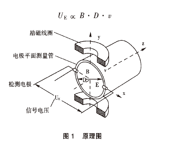 產(chǎn)生與流量成比例的感應(yīng)電勢,流體中產(chǎn)生的感應(yīng)電動(dòng)勢被位于管子徑向兩端的一對(duì)電極拾取,該信號(hào)電壓uE與磁場強(qiáng)度B、電極間距離D和平均流速穢成正比。磁場強(qiáng)度B和電極距離D是常數(shù),所以信號(hào)電壓與平均流速口成正比。計(jì)算公式如下: