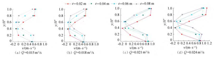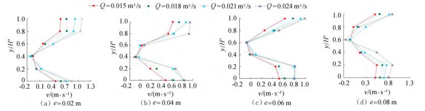 圖4橫坐標(biāo)為斷面水流方向流速,縱坐標(biāo)為測點(diǎn)垂向位置與下游水位的比值y/H'。隨著浮體結(jié)構(gòu)位置的上升,*小斷面流速位置同樣上升。以圖3(a)為例,當(dāng)e=0.02m時(shí),下游斷面位置自下而上呈現(xiàn)先減小、后增大的趨勢,在y/H'=0.40時(shí)流速達(dá)到*小,隨著浮體結(jié)構(gòu)位置的上升,*小流速呈現(xiàn)向上偏移的趨勢。在斷面位置y/H'=0.20時(shí),隨著e的增大,流速呈現(xiàn)增大的趨勢。當(dāng)e較小時(shí),流經(jīng)浮體結(jié)構(gòu)下部進(jìn)行下泄的水流較少,主流出現(xiàn)在浮體結(jié)構(gòu)的上部,且在浮體結(jié)構(gòu)的阻擋作用下出現(xiàn)回流區(qū);隨著e上升,主流偏向浮體結(jié)構(gòu)下部區(qū)域,流速增大。與y/H'=0.20的流速分布正好相反,當(dāng)y/H'=0.80時(shí),流速分布隨著浮體位置的增大而減小。隨著e的增大,通過浮體結(jié)構(gòu)下部泄流的水體增多,主流開始向下偏移。試驗(yàn)過程中,浮體結(jié)構(gòu)處于淹沒狀態(tài),流速的分布隨著浮體位置的改變呈現(xiàn)上大、中小、下大的分布趨勢,在浮體結(jié)構(gòu)下游區(qū)域形成回流區(qū),回流區(qū)的位置隨著浮體結(jié)構(gòu)的上升而上升。