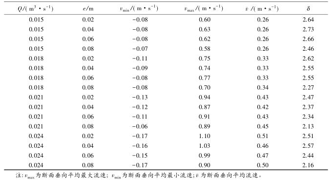 流速沿?cái)嗝娣植嫉木鶆蛱匦钥梢酝ㄟ^流速分布不均勻系數(shù)進(jìn)行表征,通過所選取斷面*大流速和*小流速的差值與該斷面平均流速的比值,δ值越大表明浮體結(jié)構(gòu)的存在對水流斷面流速的分布產(chǎn)生的影響較大。表2中,當(dāng)來流流量相同時(shí),流速的不均勻系數(shù)多數(shù)隨e的增大而減小。浮體結(jié)構(gòu)位置較小時(shí),主流為浮體結(jié)構(gòu)上部的水流。隨著浮體結(jié)構(gòu)位置的上升,來自上游的水體逐漸分成浮體結(jié)構(gòu)上部和下部的兩股主流,流速分布的不均性減小。浮體結(jié)構(gòu)位置及所處水位條件相同時(shí),來流流量的增大,區(qū)域的平均流速增大,因此流速不均勻性減小。