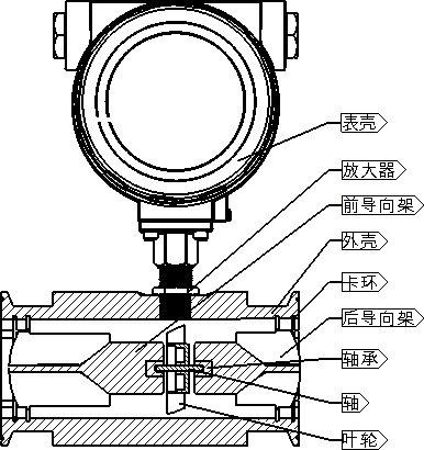 圖所示為渦輪流量傳感器結(jié)構(gòu)簡(jiǎn)圖,由圖可見(jiàn),當(dāng)被測(cè)流體流過(guò)傳感器時(shí),在流體作用下,葉輪受力旋轉(zhuǎn),其轉(zhuǎn)速與管道平均流速成正比,葉輪的轉(zhuǎn)動(dòng)周期地改變磁電轉(zhuǎn)換器的磁阻值。檢測(cè)線(xiàn)圈中的磁通隨之發(fā)生周期性變化,產(chǎn)生周期性的感應(yīng)電勢(shì),即電脈沖信號(hào),經(jīng)放大器放大后,送至顯示儀表顯示。