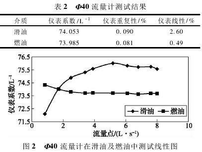 依據(jù)表1測試數(shù)據(jù),經(jīng)計算可得,Φ40流量計在滑油及燃油中測試結果如表2所示,測試線形圖如圖2所示。