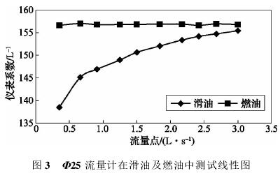 依據(jù)表3測試數(shù)據(jù),經(jīng)計算可得,Φ25流量計在滑油及燃油中測試結果如表4所示,測試線形圖如圖3所示。