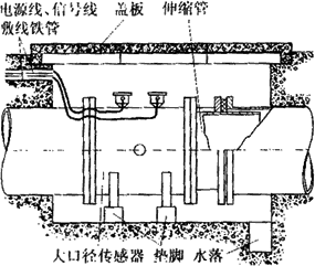 由于大口徑管道在多數(shù)場合下是埋在地下的,因此大口徑傳感器在安裝前應做好水泥地坑。圖6-19所示是在給排水系統(tǒng)中常見的安裝形式。水泥地坑應有足夠的活動空間,側(cè)壁埋有敷設(shè)電纜的鋼管,上有蓋板防止雨淋,下有泄水管以免坑內(nèi)積水而使傳感器侵水。為了拆裝方便,傳感器應放在墊腳上,且在下游側(cè)裝有活絡(luò)的伸縮管。圖6-20是測量鹽水流量計在地下水泥管污水排放系統(tǒng)中的安裝實例。