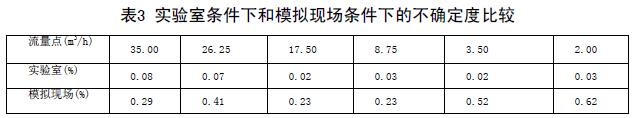實驗室條件下和模擬現(xiàn)場條件下的不確定度比較(表3)兩次結(jié)果可以看出,兩次實驗各個流量點的不確定度差距非常大??梢?,皮革廠污水管道流量計對安裝條件還是比較苛刻的。