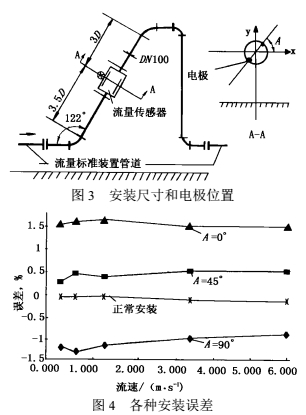 除儀表前直管段可降低彎管影響外,人們還從安裝方式上設(shè)法降低影響的方法。文獻(xiàn)曾報(bào)道電磁流量傳感器電極軸線與鄰近彎管平面成45°傾斜安裝可以減少?gòu)澒苡绊?。日本工業(yè)標(biāo)準(zhǔn)B7554“解說(shuō)部分”列有電極軸線與彎管平面垂直、平行、成45°三種安裝方式,在不同長(zhǎng)度直管下的測(cè)量誤差范圍,也說(shuō)明這一效果。
