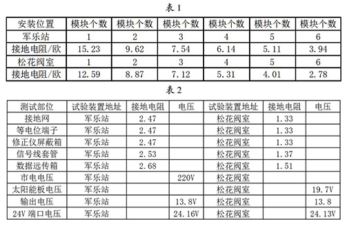 接地網(wǎng)的安裝與連接:接地網(wǎng)是整個乙二醇流量計防雷試驗(yàn)比較關(guān)鍵的一個內(nèi)容,能不能準(zhǔn)確的論證試驗(yàn)的有效性,必須保證接地網(wǎng)達(dá)到標(biāo)準(zhǔn)的接地電阻,通過對實(shí)地地電阻率的測試,初步選擇6個接地模塊埋設(shè)并配用降阻劑使用,邊安裝邊測試直到達(dá)到標(biāo)準(zhǔn)值后才引入等電位箱。在軍樂站和松花閥室安裝模塊并測試數(shù)據(jù)見表1。