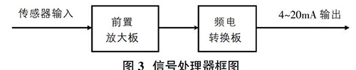 信號處理器對渦街流量傳感器產生的頻率信號經(jīng)過濾波、放大、頻電轉換等幾個環(huán)節(jié)處理,*終將頻率信號轉換為標準4~20mA信號輸出。信號處理器框圖如圖3所示。