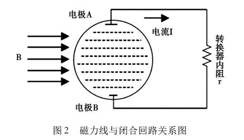 2. 1 正交干擾衛(wèi)生型卡箍電磁流量計的磁路系統(tǒng)包含有兩個勵磁線圈,而導管內(nèi)的液體與傳感器電極及轉(zhuǎn)換器結構組成了一個閉合的回路,如圖2 所示。理論情況下,磁力線( 圖中B) 應與閉合回路相平行,但是由于裝配過程中的誤差,導致磁力線不可能完全平行于這一閉合回路,出現(xiàn)部分磁力線成一定角度穿過回路的現(xiàn)象,這引起了即使沒有液體流動的情況下,傳感器的電極上也會產(chǎn)生感應電動勢,就形成了正交干擾的基本形式。
