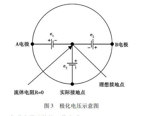 在被測液體與電極和接液部件接觸過程中,電解質(zhì)中的正負離子會分別作定向運動,這會使被測液體在電極和接液部件之間形成電位差,通常將這種現(xiàn)象稱為極化現(xiàn)象。如圖3 所示,理論上來說,兩電極A 和B 對接液部件的電位e1、e2大小相等、方向相反,此時兩電極的電位差等于零。但是,若兩電極的材質(zhì)或表面狀態(tài)存在差異,此時A、B 電極之間的電位差就不為零,這就形成了極化電壓,極化電壓與共模狀態(tài)的電壓e3一起疊加在流量信號中,被輸入轉(zhuǎn)換器的差動放大器。當極化電壓過大,則會對差動放大器的輸入端造成較大影響,導致信號無法放大或流量信號的輸出波動過大,從而降低了衛(wèi)生型卡箍電磁流量計的測量精度。