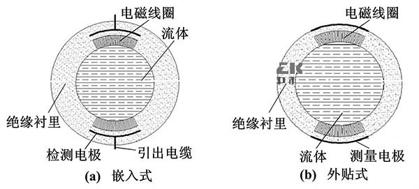 電極與被測流體通過絕緣管形成檢測電容,通過此電容來藕合流量信號。其主要的結(jié)構(gòu)形式按照電極的安裝位置可以分為兩種:電極嵌人測量管的絕緣襯里內(nèi)部(嵌人式)、電極貼在測量管外部(外貼式)。嵌入式結(jié)構(gòu)與普通工業(yè)污水流量計結(jié)構(gòu)相似,而外貼式大多是通過陶瓷表面金屬化技術(shù)將電極貼在測量管外。
