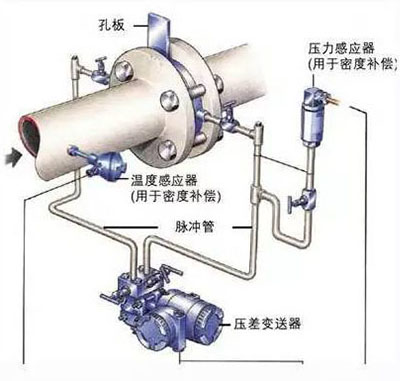通過引壓管將差壓信號(hào)引入差壓變送器,差壓變送器將差壓信號(hào)送入流量積算儀,積算儀將差壓信號(hào)換算成流量信號(hào)。同時(shí)通過溫度和壓力傳感器測(cè)出蒸汽的溫度和壓力,積算儀根據(jù)當(dāng)時(shí)的溫度和壓力計(jì)算出補(bǔ)償后的流量。