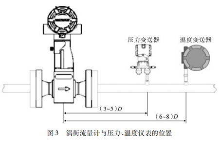 氮氣流量計的口徑如果與工藝管道相同,不能滿足流量儀表要求時,或者在此流速下測量準確度不能保證時,需要縮小儀表口徑,從而提高管內(nèi)流速,保證測量精度。上下游必須有足夠的直管段,若傳感器安裝點的上游在同一平面上有 2 個 90°彎頭時,上游直管段≥25D,下游直管段≥5D。根據(jù)測量的需要,需在氮氣流量計附近測量壓力和溫度時,測壓點應(yīng)在傳感器下游的( 3 ~ 5) D 處,測溫點應(yīng)在傳感器下游的( 6 ~ 8) D 處,如圖 3 所示。