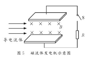 【例1】圖5為磁流體發(fā)電機(jī)示意圖。設(shè)兩金屬板間的距離為d,兩極板間勻強(qiáng)磁場的磁感應(yīng)強(qiáng)度為B。等離子體垂直進(jìn)入磁場的速度為v,單個離子所帶的電荷量為q。離子通道(即兩極板內(nèi)所圍成的空間)的等效電阻為r,負(fù)載電阻為R。則下列判斷正確的是( ?。?br /> A。該發(fā)電機(jī)的電動勢E=Bdv
