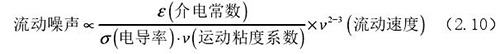 流動噪聲主要出現(xiàn)在低電導(dǎo)率流體的檢測中,由輸出端輸出的直流極化電壓時(shí)常出現(xiàn)左右擺動的現(xiàn)象,而此種擺動的電壓被稱為流動噪聲。上式(2.5)中可以觀察了解到流體電導(dǎo)率和流動噪聲呈現(xiàn)出負(fù)相關(guān)關(guān)系,由此可以了解到在進(jìn)行低電導(dǎo)率的計(jì)算中需要重點(diǎn)考慮位移電流。