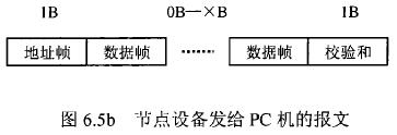 在飲用水流量計(jì)等節(jié)點(diǎn)設(shè)備和C機(jī)通信的過(guò)程中,由地址幀、命令幀、數(shù)據(jù)幀、校驗(yàn)和可組成各種功能不同的報(bào)文。由于采用主從工作方式來(lái)實(shí)現(xiàn)通信,飲用水流量計(jì)等節(jié)點(diǎn)設(shè)備僅能接收并執(zhí)行PC機(jī)發(fā)送來(lái)的控制命令,而不能發(fā)送命令給PC機(jī)。因此,由PC機(jī)發(fā)往流量計(jì)等節(jié)點(diǎn)設(shè)備的報(bào)文一般包括一個(gè)地址幀,一個(gè)命令幀,若干個(gè)數(shù)據(jù)幀和一個(gè)校驗(yàn)和,其報(bào)文格式圖.6a5所示;而由流量計(jì)等節(jié)點(diǎn)設(shè)備發(fā)往PC機(jī)的報(bào)文一般包括一個(gè)地址幀,若干個(gè)數(shù)據(jù)幀和一個(gè)校驗(yàn)和,其報(bào)文格式如圖6.5b所示。