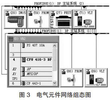 (1)電氣元件組態(tài)。把增加的質量流量計和變頻器添加到香料廚房 S7-400 PLC 控制系統(tǒng)的 PROFIBUS 網(wǎng)中,其網(wǎng)絡組態(tài)如圖 3 所示,圖中 PROFIBUS-DP 地址 88 和 89 為硬件系統(tǒng)增加的質量流量計和變頻器。